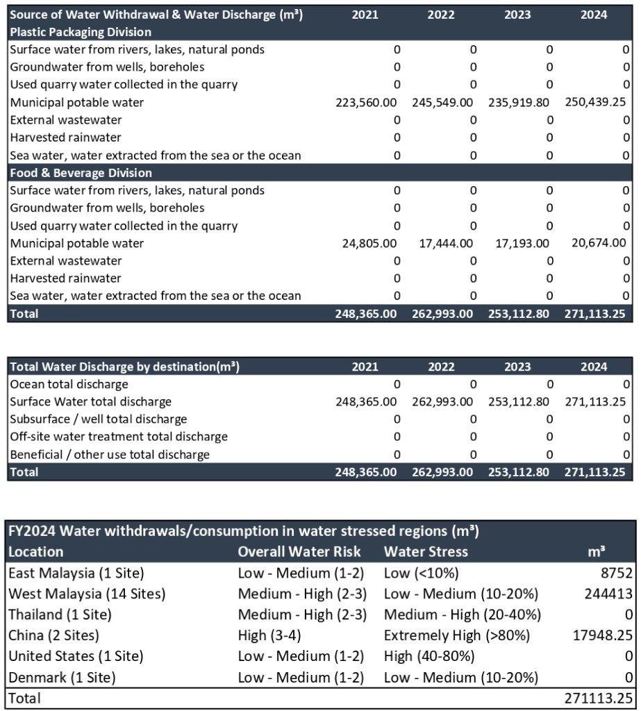 We ensure that quality of discharged water complies with legislative requirements. COD (chemical oxygen demand) load/tonne product for our 3 major plastic packaging plants located in Sungai Petani is 0.237g/tonne in 2021. These 3 production plants represent 70% of our group total production output.